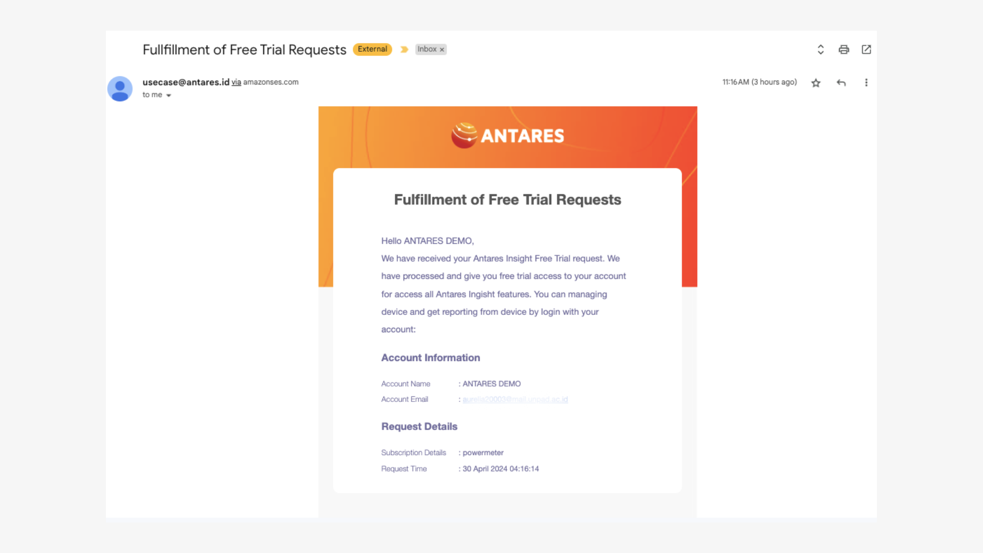 Periksa email anda yang terdaftar pada akun antares karena anda juga akan mendapatkan notifikasi melalui email terkait informasi akses freetrial yang diberikan oleh antares.