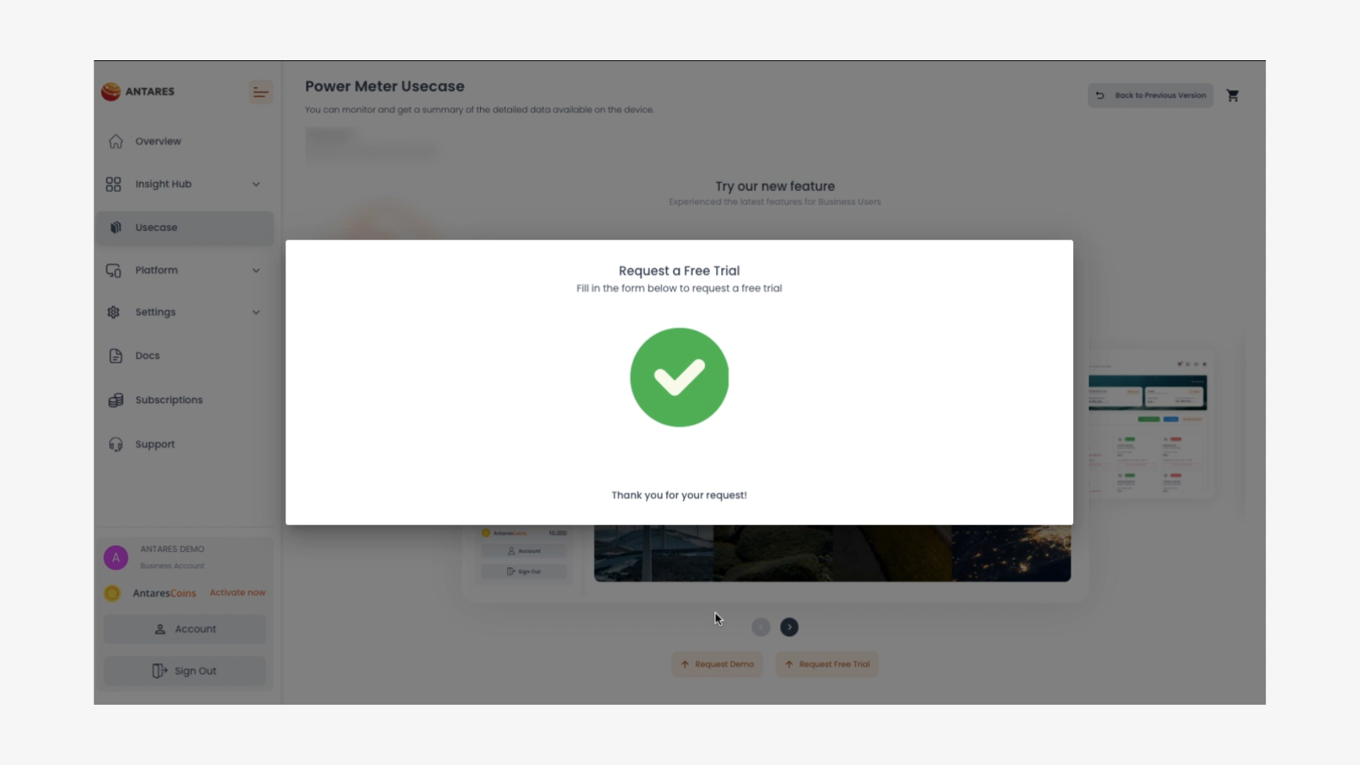 Request Free Trial adalah fitur dimana anda dapat mengakses halaman Antares Insight selama **3 bulan secara gratis**. Pada halaman free trial  anda akan diberikan akses penuh untuk mengelola usecase, application dan device.&#x20;