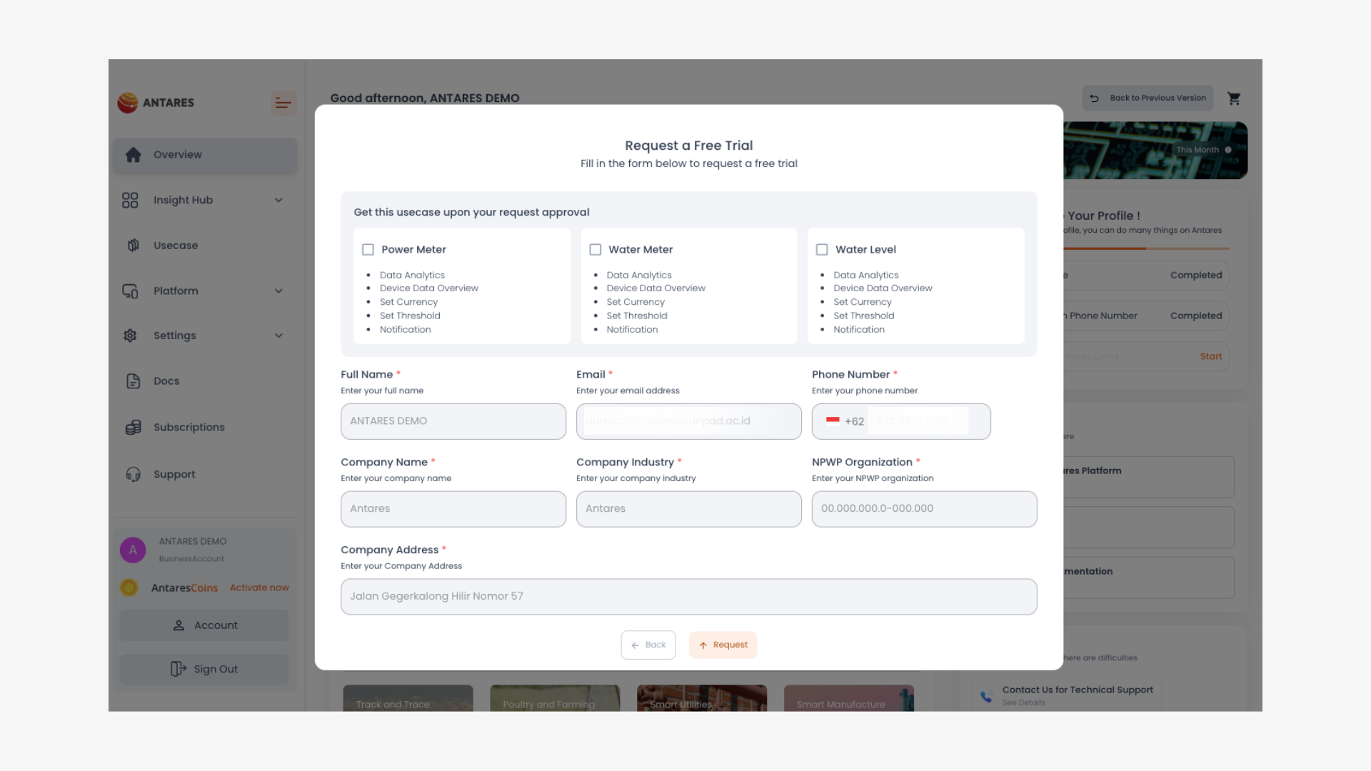 Pada kolom Request a Free Trial, pilih usecase yang Anda butuhkan untuk Free Trial (Power Meter / Water Meter / Water Level). Anda dapat memilih **lebih dari 1 usecase**. Periksa kembali data-data yang otomatis terisi pada form request free trial, jika sudah sesuai kemudian klik "Request".