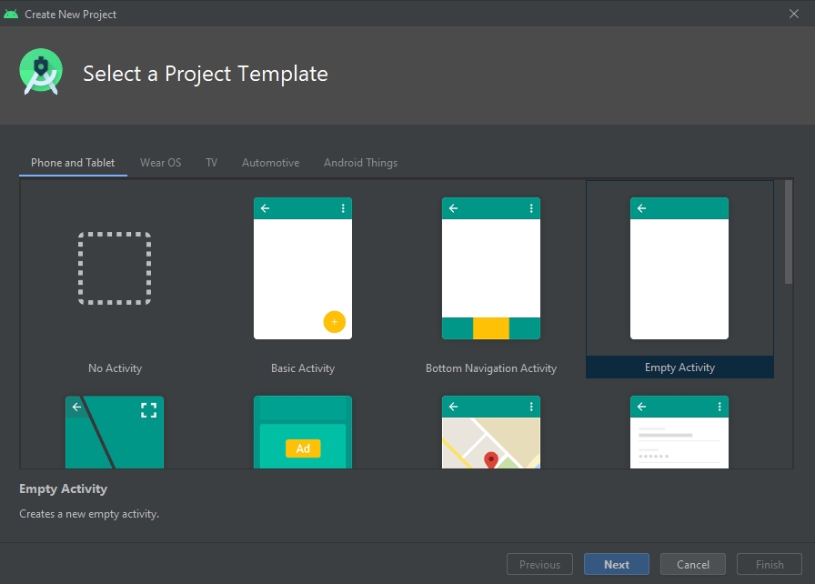 Definisikan Activity Anda. Kami menyarankan Anda untuk memilih "Empty Activity".