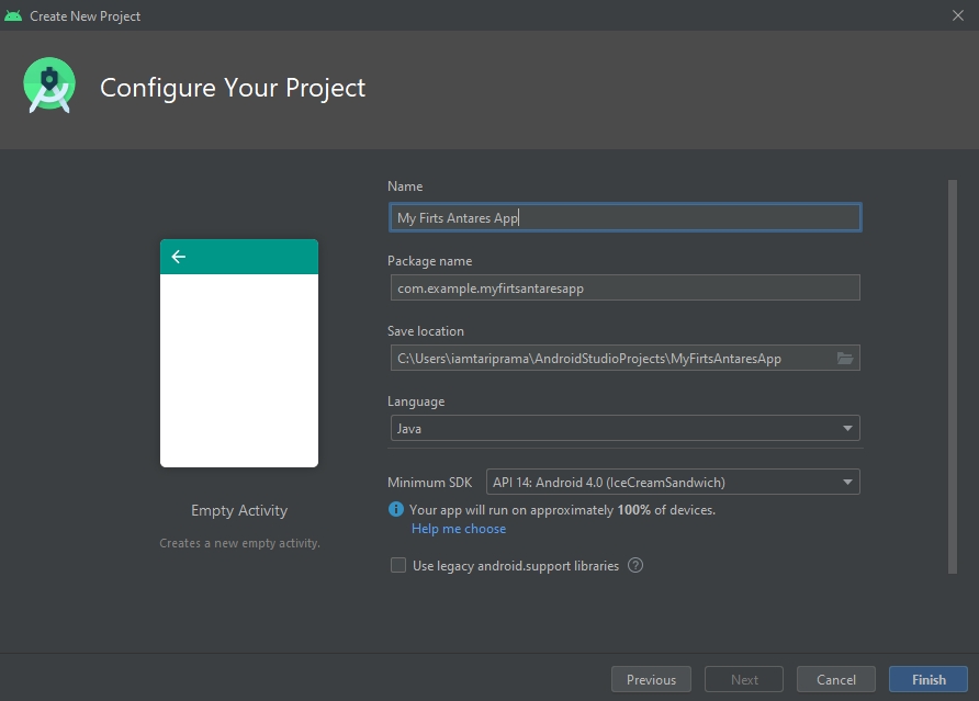 Beri nama Activity Anda. Kami menyarankan Anda untuk memilih pilihan default "MainActivity".