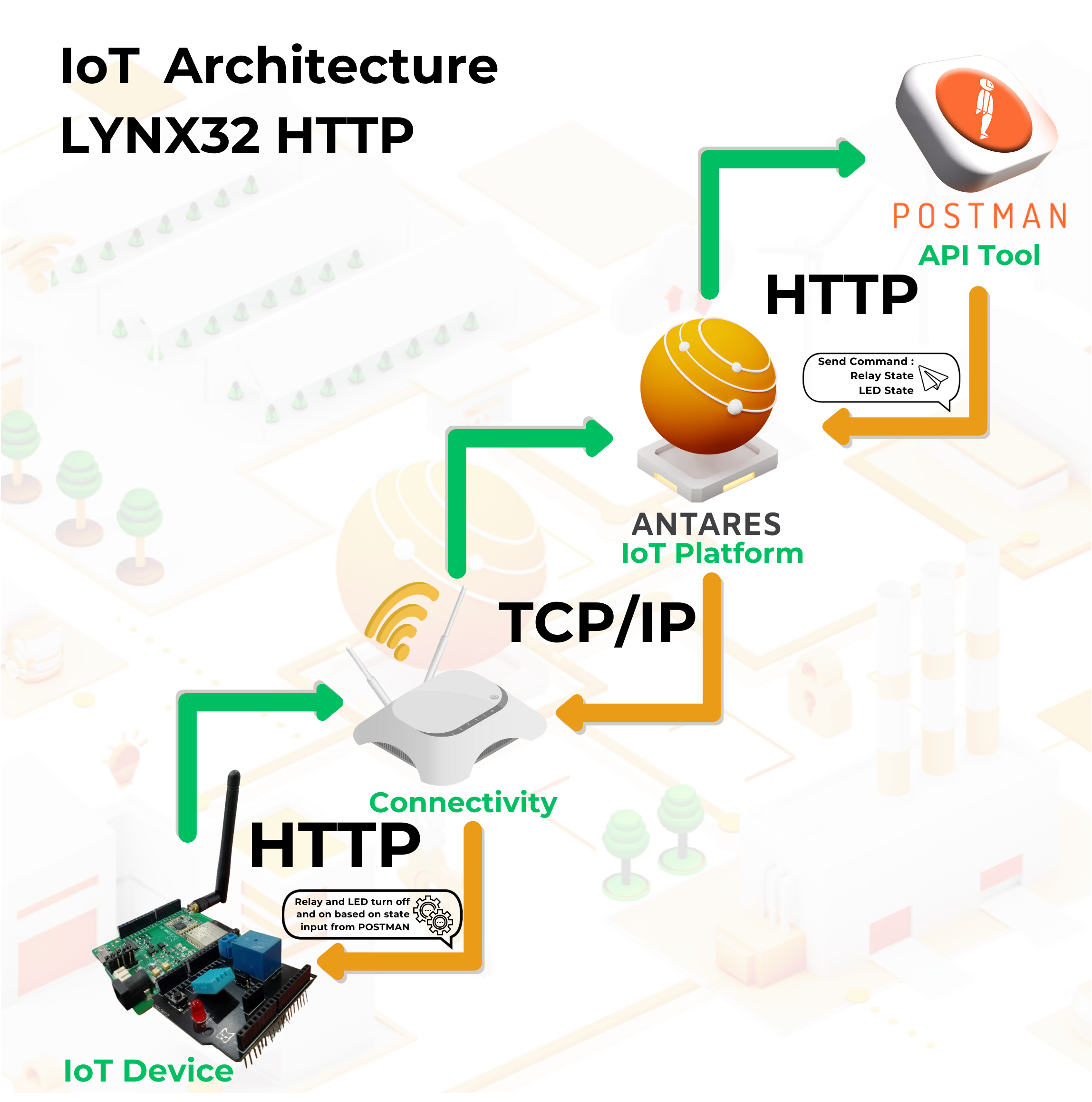 Pada project ini, Anda akan menggunakan Shield Workshop Antares pada modul Development Board Lynx-32 . Pada Shield Workshop Antares ini terdapat sensor suhu, kelembapan (DHT11), relay, LED, dan push button. Anda akan melakukan Post Data menggunakan software POSTMAN yang berisi perintah untuk mengontrol LED dan relay. Kemudian Development Board Lynx-32 melakukan Get Data dari Antares IoT Platform yang berisi dua opsi perintah, yaitu apabila masukan Relay bernilai 1 maka relay akan menyala; masukan Relay bernilai 0 maka relay akan mati; LED bernilai 1 maka LED akan menyala; masukan LED bernilai 0 maka LED akan mati.