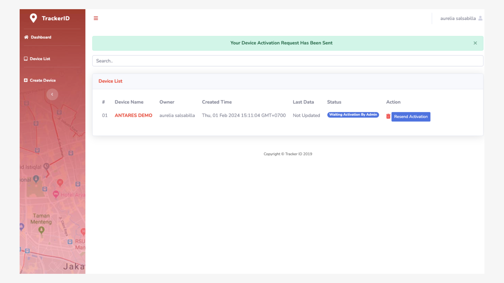 13. Selanjutnya jika perangkat sudah di aktifkan oleh admin maka Device List akan menampilkan informasi seperti berkut. Setelah mengikuti langkah-langkah diatas maka anda telah dapat memonitoring perangkat GPS anda pada dashboard TrackerID