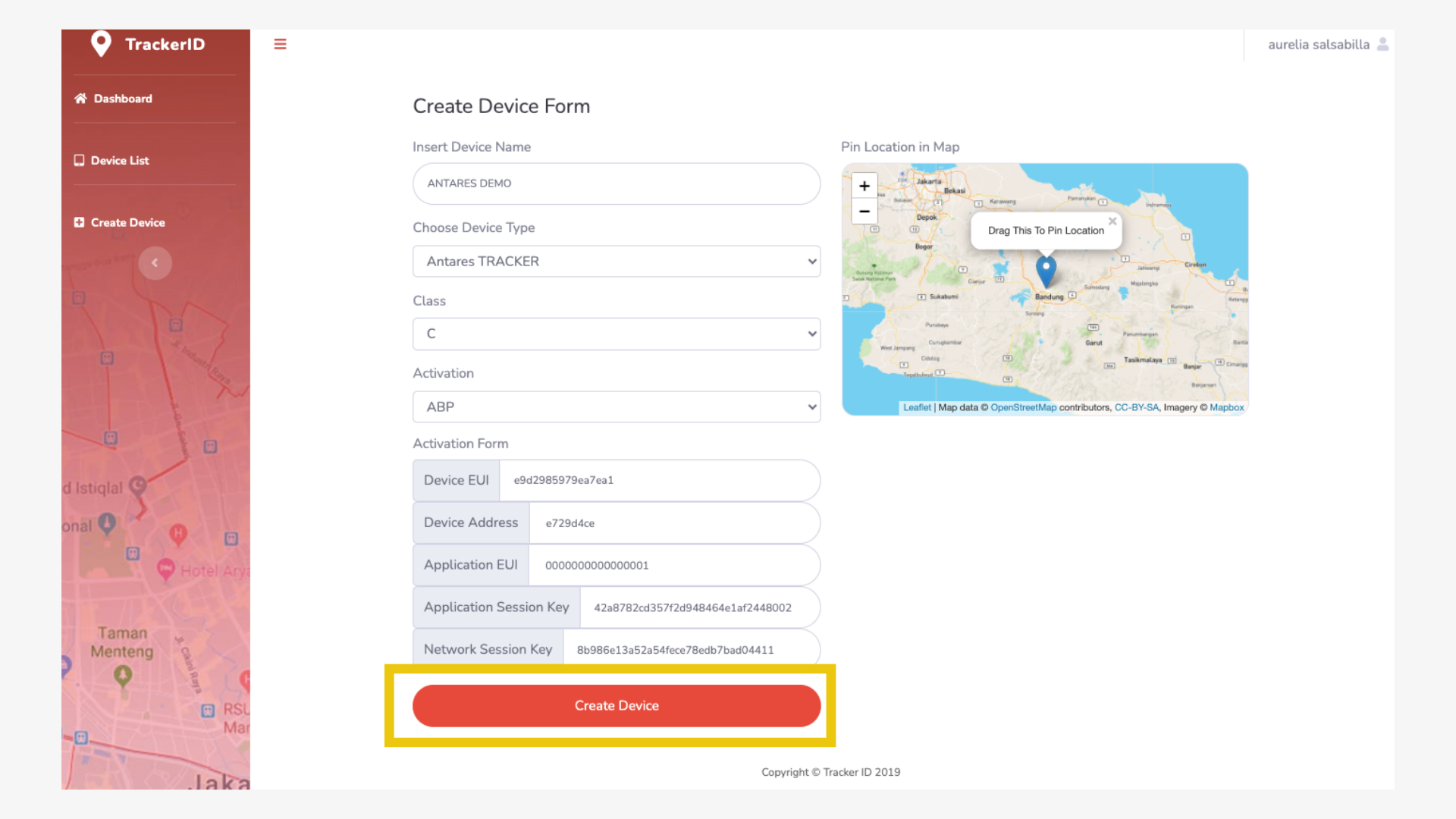 5. Setelah berhasil login dengan akun TrackerID yang baru saja anda buat, anda akan melihat halaman konsol seperti diatas dan klik **Create Device** untuk menambahkan perangkat yang anda miliki.