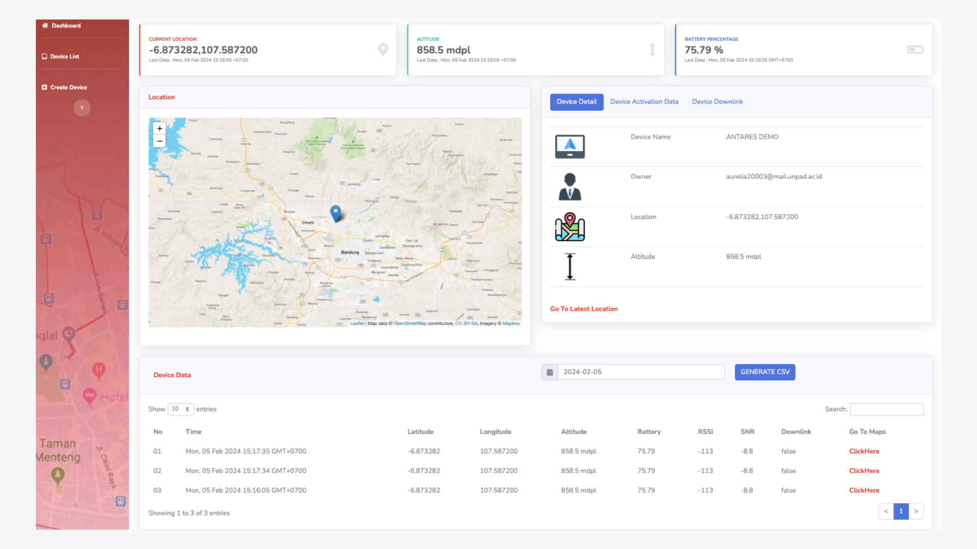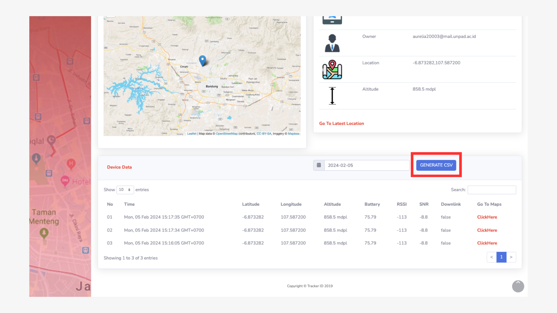 15. Anda juga dapat **mengunduh data** pada perangkat anda dalam format .csv dengan klik **GENERATE CSV**. selain itu anda juga dapat melihat lokasi spesifik pada waktu tertendu dengan klik pada kolom **Go To Maps**.
