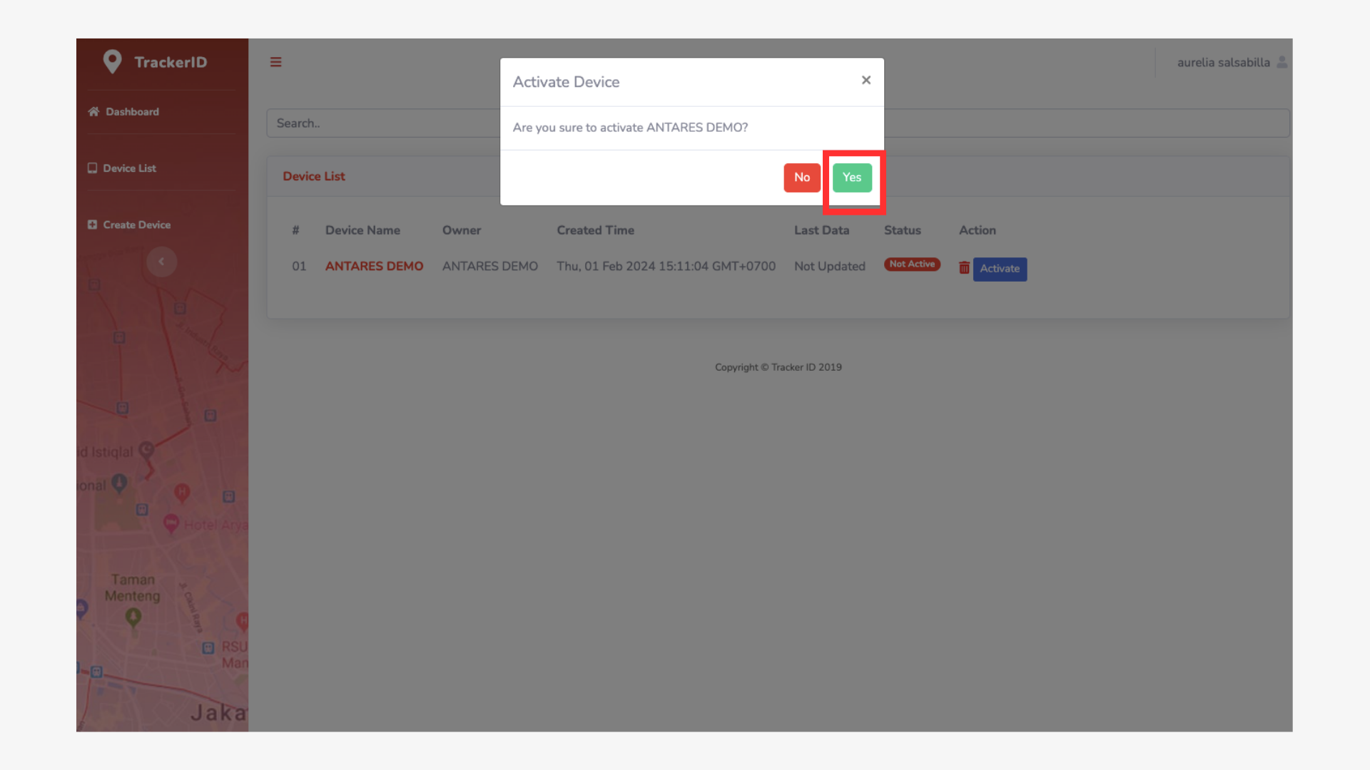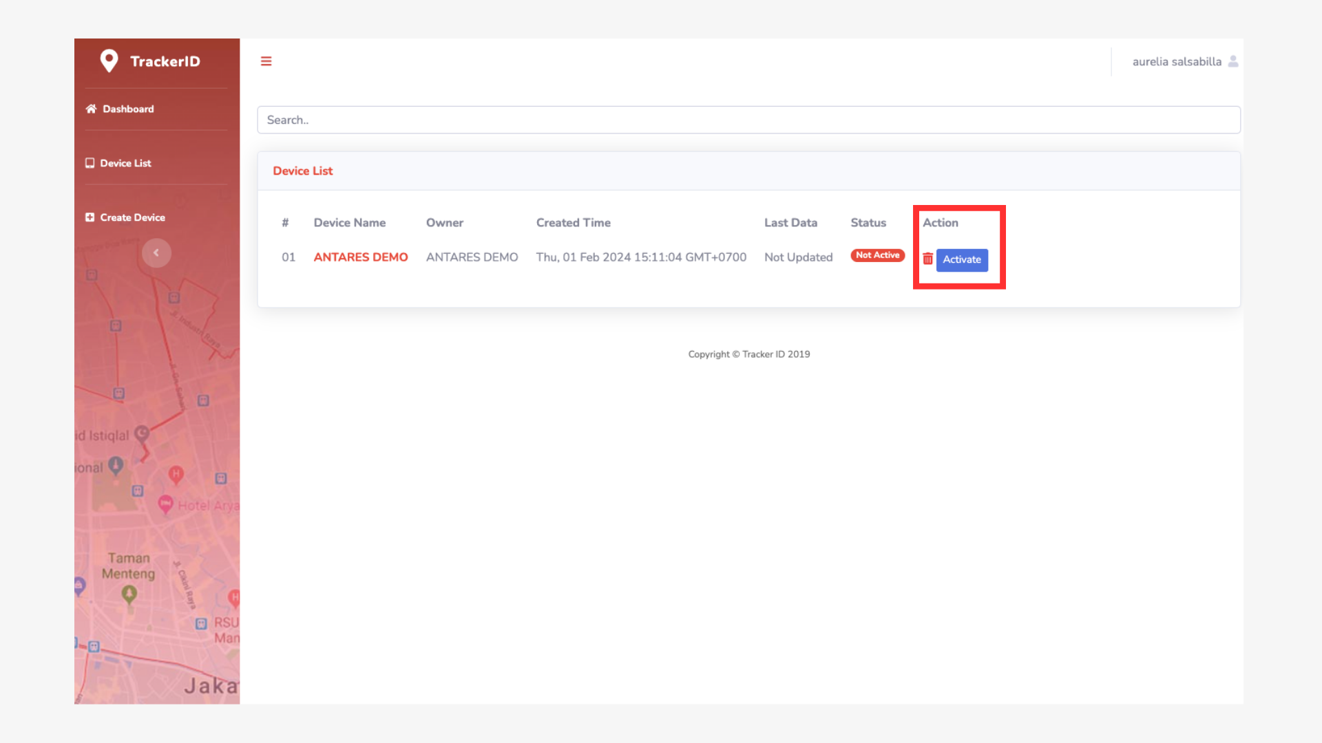 9. Setelah mendaftarkan perangkat maka anda akan dialihkan ke halaman **Device List** pada konsol TrackerID dan silahkan aktifkan perangkat anda dengan klik tombol **Activate** pada Device List.