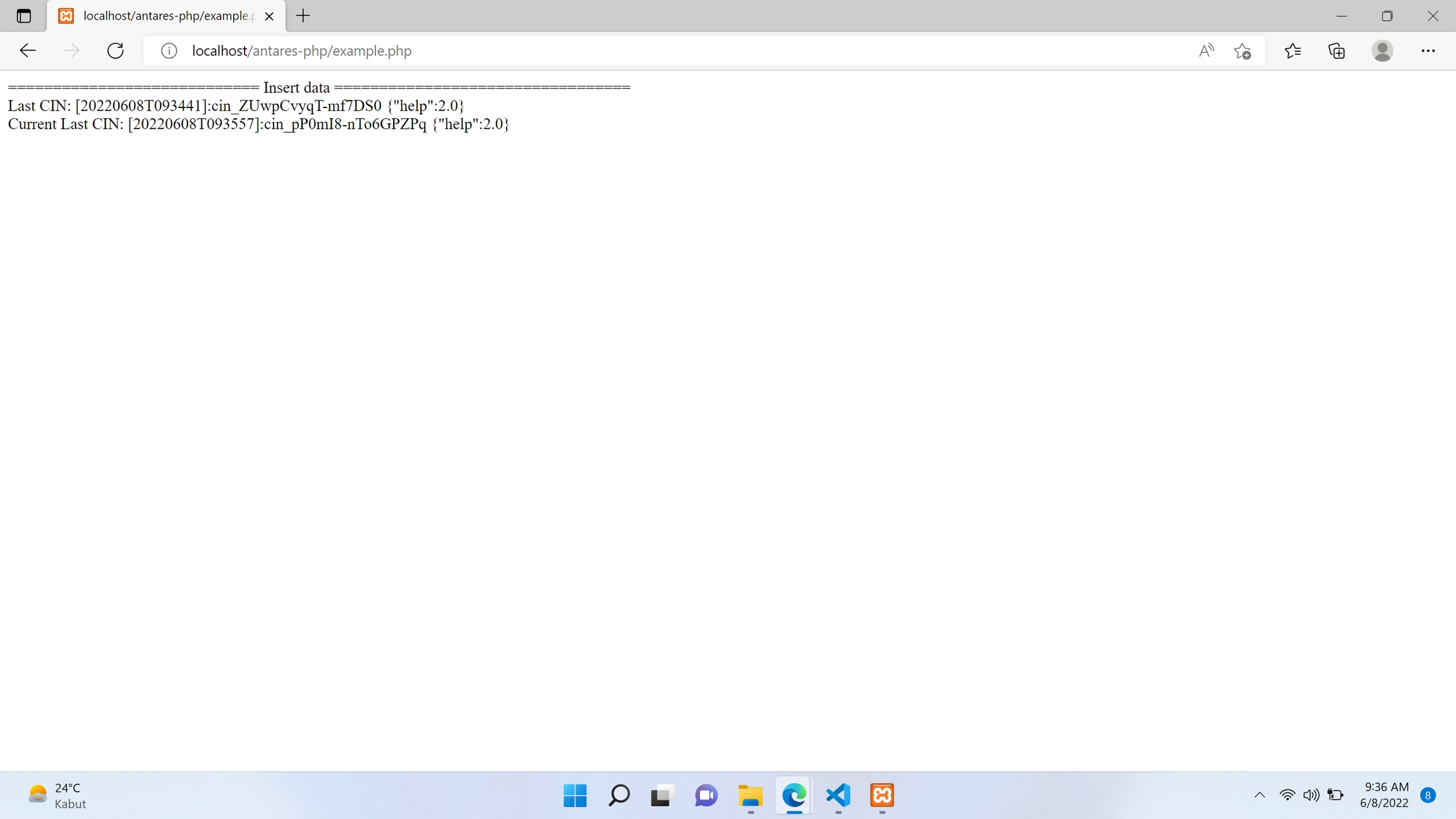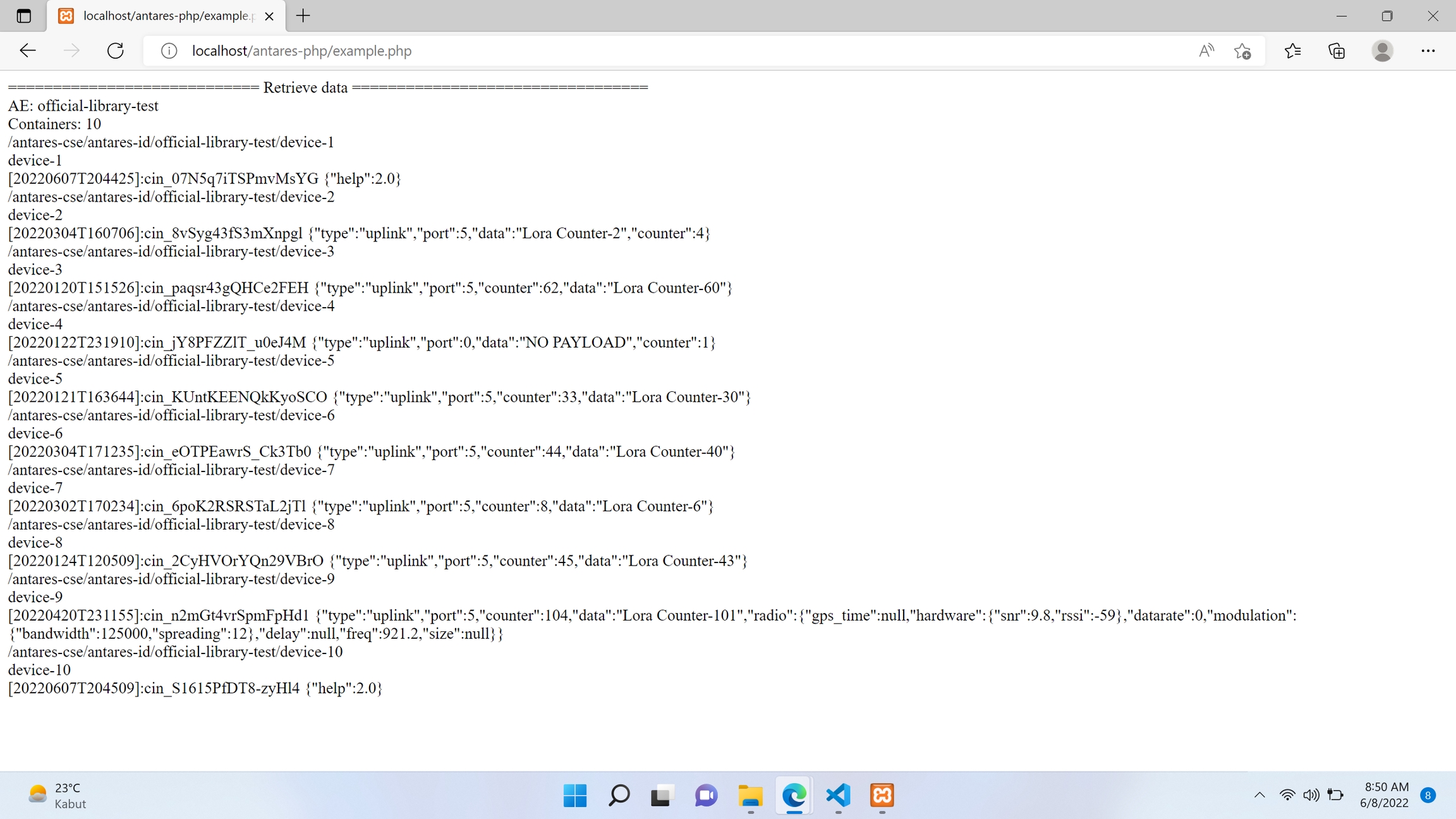 Langkah selanjutnya buka http://localhost/antares-php/example.php (sesuai folder penyimpanan pada htdocs) pada browser, kemudian akan muncul hasil seperti berikut: