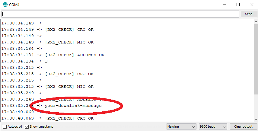 Jika menggunakan board arduino dapat menggunakan Baud Rate 9600 untuk melihat data downlink yang diterima. Berikut contoh serial monitor saat berhasil menerima downlink:<br>