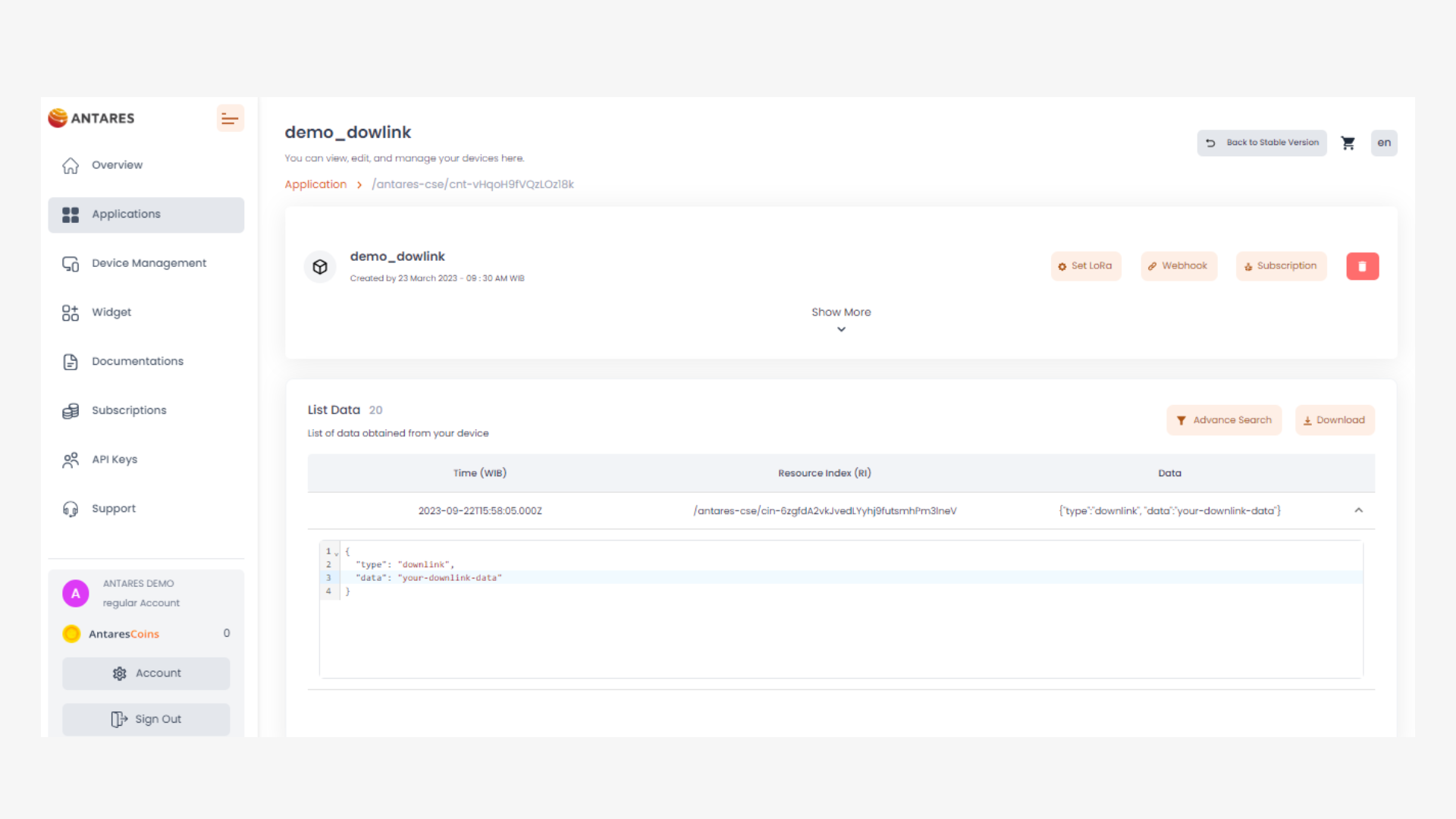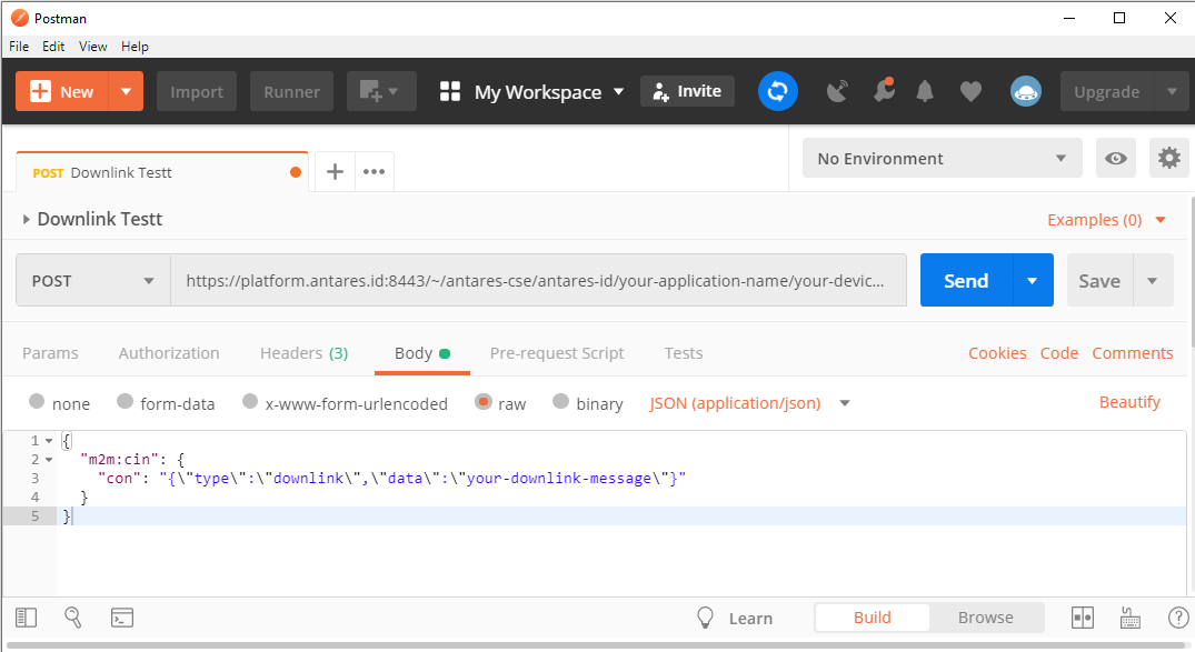 Setelah Anda selesai melakukan konfigurasi pada perangkat dan perangkat sudah dipastikan dapat mengirim data ke ANTARES, saatnya mencoba untuk mengirim downlink ke device melalui Platform ANTARES dengan menggunakan software POSTMAN