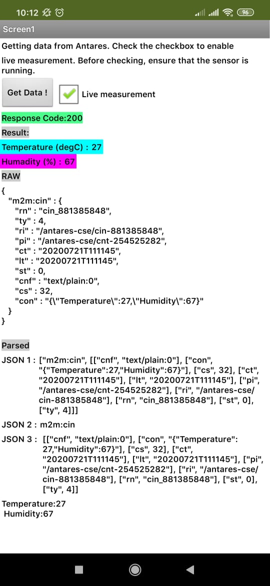Setelah kita mendesain dan memprogram aplikasinya, maka kita dapat melihat hasilnya pada aplikasi android yang kita buat tadi. Data yang ditampilkan yaitu data terakhir dari console di ANTARES yang memiliki format JSON. Berikut adalah tampilan hasilnya:<br>