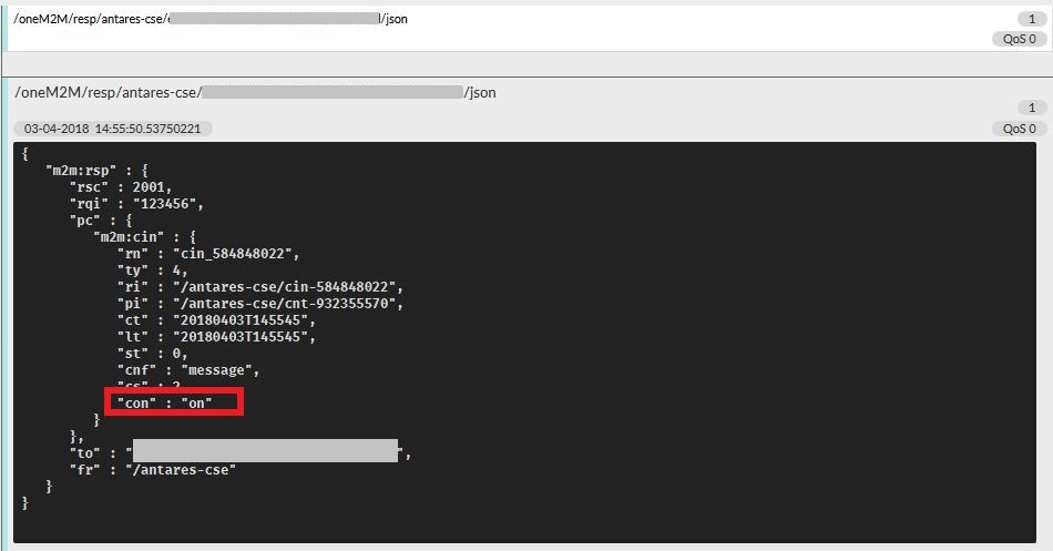 /oneM2M/req/your-access-key/antares-cse/jsonIsi{ "m2m:rqp": { "fr": "your-access-key", "to": "/antares-cse/antares-id/application-name/device-name", "op": 1, "rqi": 123456, "pc": { "m2m:cin": { "cnf": "message", "con": "on" } }, "ty": 4 } }