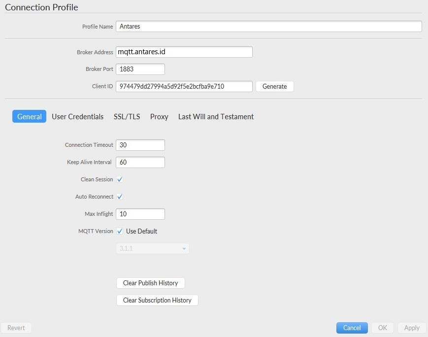Pertama, Anda perlu mengonfigurasi agar Anda dapat terhubung dengan MQTT Broker kami. Konfigurasi ditunjukkan seperti dibawah ini.