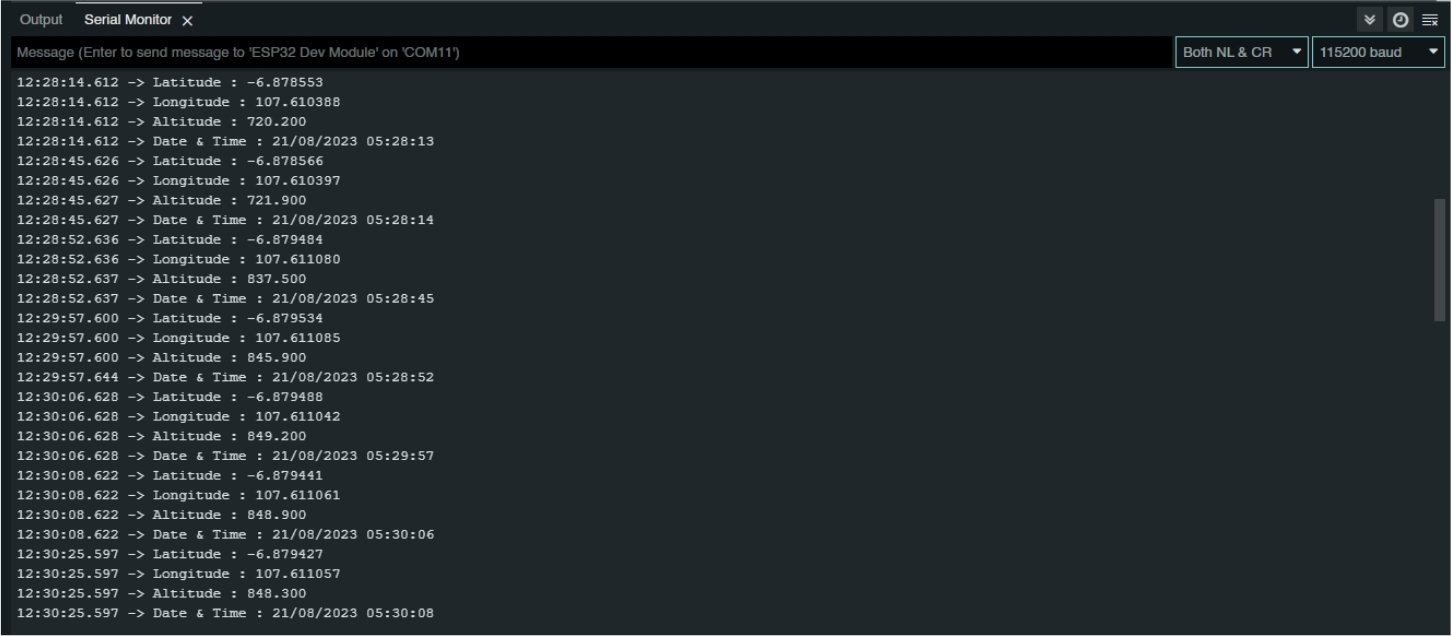Ketika antena telah menerima cukup sinyal, maka data GNSS yang akan ditampilkan pada serial monitor menjadi seperti pada gambar di bawah.