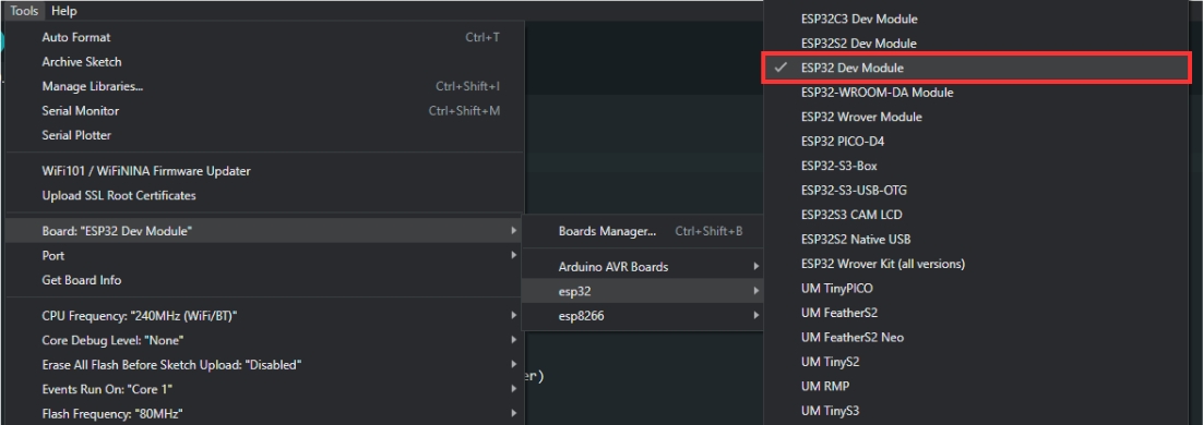 Pertama, Anda harus mengatur board yang digunakan dengan memilih ESP32 Dev Module pada bagian Tools > Board > esp32.