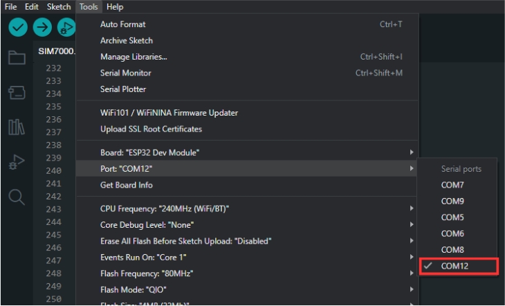 Setelah itu, Anda perlu mengatur port yang digunakan dengan membuka Tools > Port > COM(X). Nilai X menyesuaikan dengan nomor port yang digunakan oleh board NB-LYNX-7000.