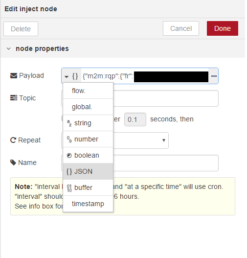 *Node* “inject” dapat diubah untuk memberikan tipe data lain. Pada kasus ini, tipe data yang digunakan adalah JSON.