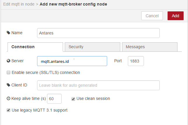 <figure><img src="https://content.gitbook.com/content/rRkxjRLeqOm0pNhLfsus/blobs/bqSDRjgSa0TKvtPMw2DA/image.png" alt=""><figcaption><p>Gambar 7. Pengaturan <em>Node</em> MQTT</p></figcaption></figure>