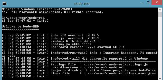 <figure><img src="https://content.gitbook.com/content/rRkxjRLeqOm0pNhLfsus/blobs/GnrNcoXTcTHpDY1hNgIU/image.png" alt=""><figcaption><p>Gambar 1. Menjalankan Node-RED</p></figcaption></figure>