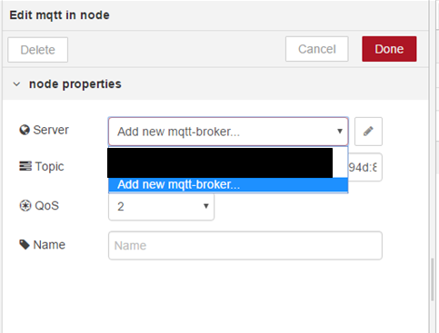 Penambahan broker baru dapat dilakukan dengan memilih “add new mqtt-broker” dan mengklik ikon sebelah kanan. Pengaturan broker dapat dilakukan hanya dengan mengklik ikon sebelah kanan.