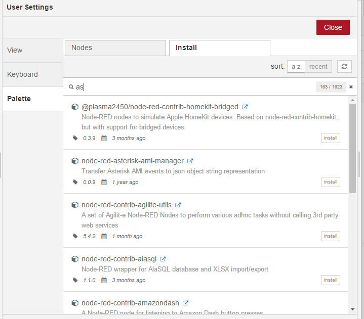 Sebuah jendela akan muncul. Menu “nodes” menunjukkan *nodes* yang sudah terpasang, sementara menu “install” menunjukkan *nodes* yang dapat diunduh dan dipasang.
