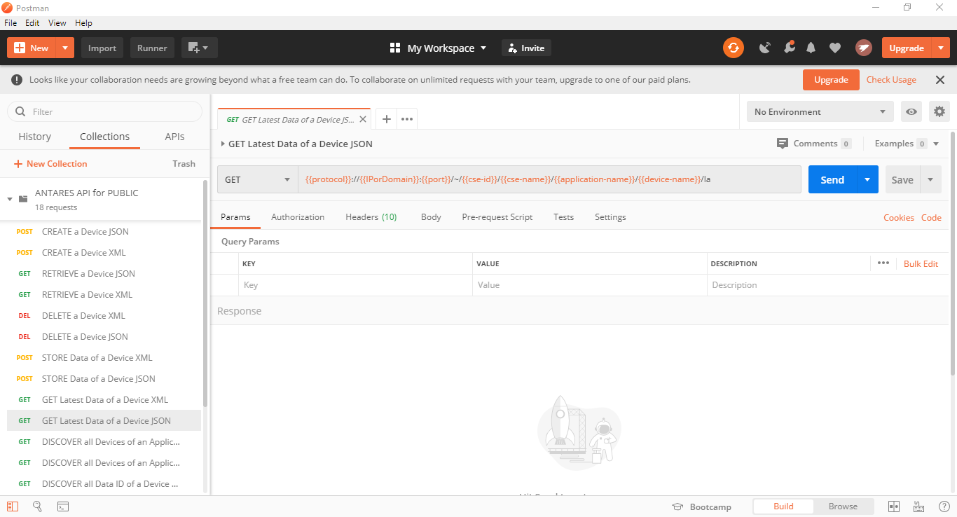 1. Buka folder ANTARES API for Public pada tab collection di workspace anda. Dalam folder tersebut terdapat list fungsi-fungsi API. Pilih Store data of a device dengan icon POST. Terdapat dua jenis fungsi API store data yaitu XML dan JSON. Perbedaan keduanya hanya pada jenis format pengiriman konten data, anda dapat menggunakan salah-satu format tersebut.