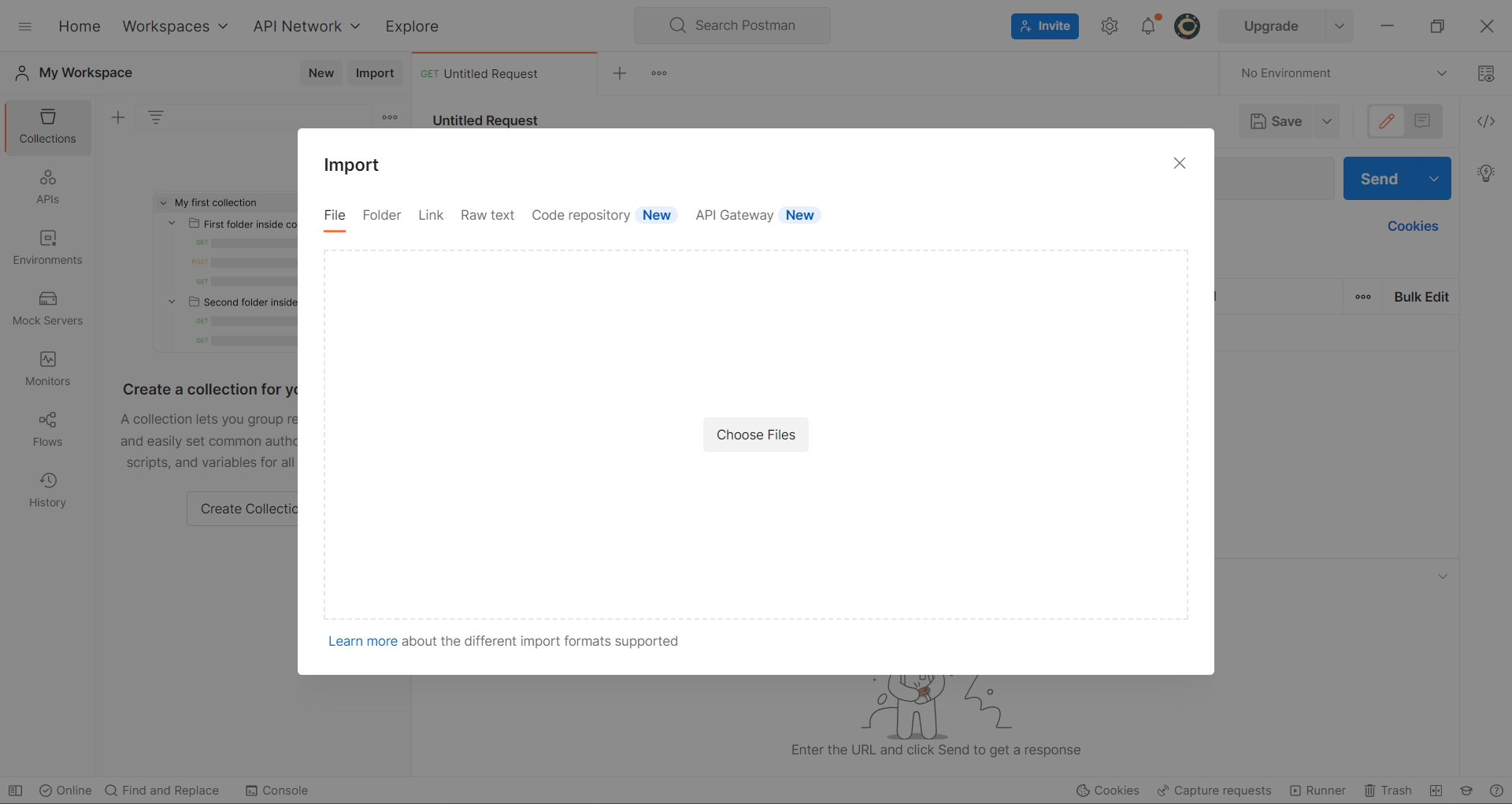 Lalu akan muncul menu untuk melakukan import collection.<br>