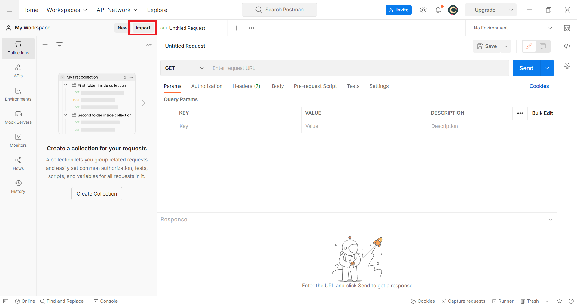 1. Buka tools import pada toolbar di workspace Postman.<br>