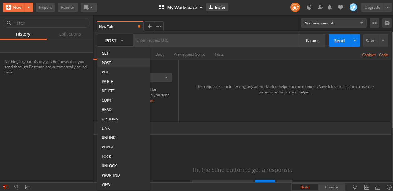 Pada tampilan default landing page Postman, terdapat workspace untuk mengoperasikan fungsi-fungsi Postman. Anda dapat membuat request, collection, environtment, API, dan lainnya pada bagian launchpad. Postman juga memberikan in-app's tutorials yang dapat anda akses dengan mudah pada launchpad.