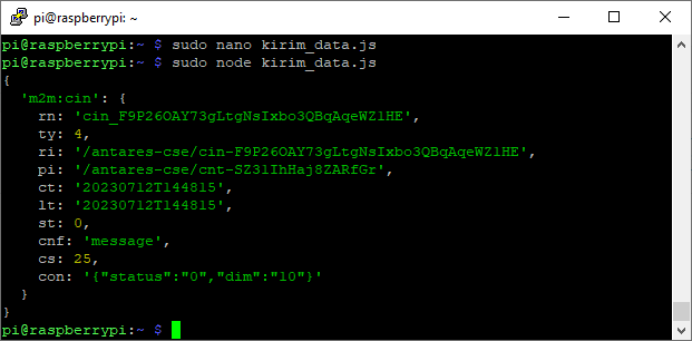 <figure><img src="https://3995702122-files.gitbook.io/~/files/v0/b/gitbook-x-prod.appspot.com/o/spaces%2FrRkxjRLeqOm0pNhLfsus%2Fuploads%2FWcFx56XOoqGwTpR0eNli%2F142.png?alt=media&#x26;token=0820c181-7ab0-4df2-be20-5cfb451c1991" alt=""><figcaption><p>Tampilan pada Antares IoT Platform yang Telah Menerima Data dari Raspberry Pi</p></figcaption></figure>