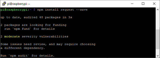 Supaya Raspberry Pi dapat mengirimkan data ke platform Antares, perlu dilakukan instalasi modul **request** pada Node.js. Anda dapat menginputkan syntax di bawah untuk melakukan instalasi.