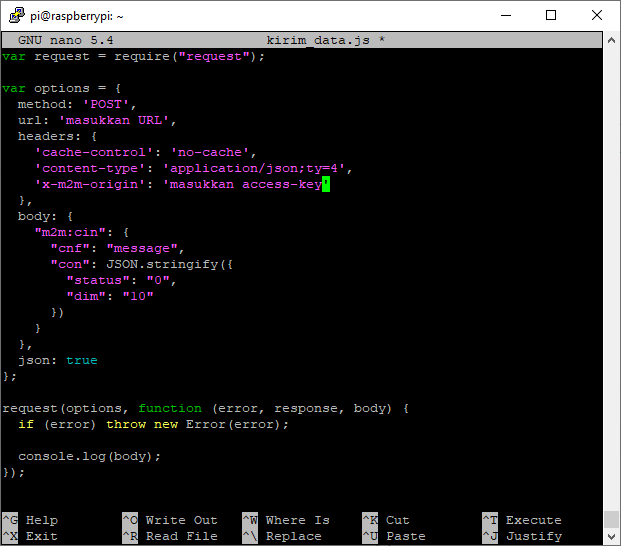 Jangan lupa untuk menginputkan **URL device** pada bagian **url** dan **access-key** pada bagian **x-m2m-origin** sesuai yang terdapat pada Antares IoT Platform. Pastikan tidak ada kesalahan penulisan program dan perhatikan indentasinya.