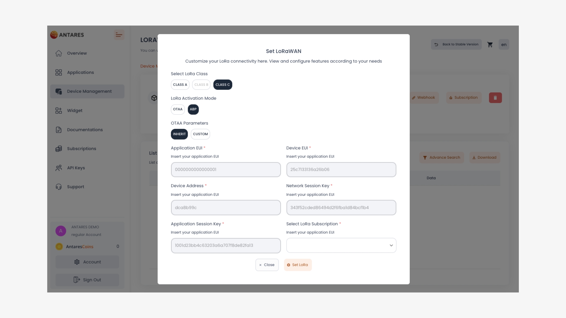 Pada halaman Device console Antares lakukan Set LoRa dengan menekan button Set LoRa seperti gambar berikut.