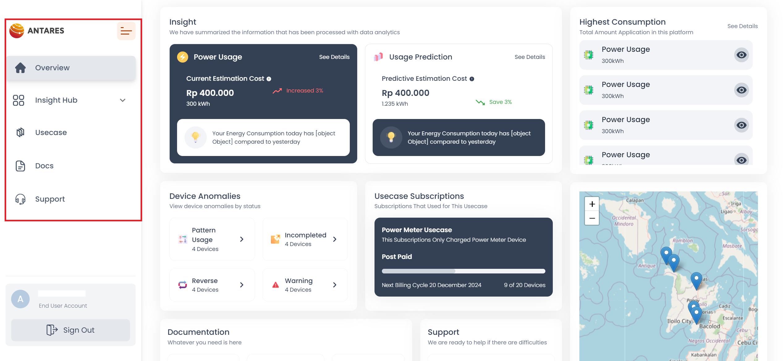 You can see the demo data on the left navigation bar when you login successfully. You can see **Overview**, **Antares Insight** and **Usecase**.