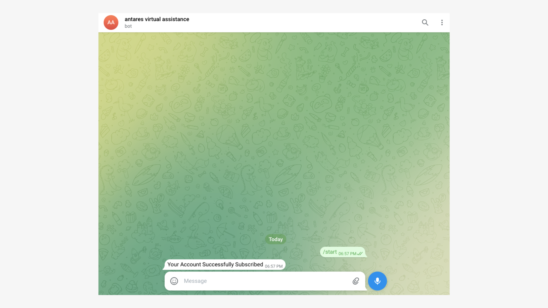 After opening the Telegram app, you will be in a chat room with Antares Virtual Assistance. Then, click ‘Start’