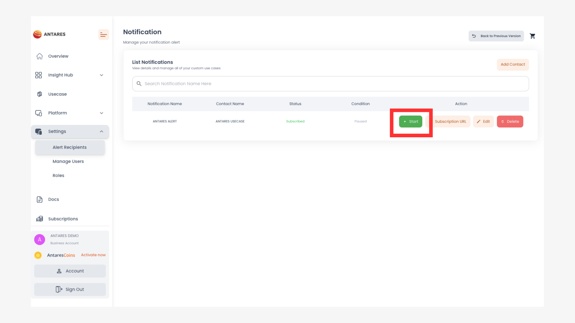 Please return to the Alert Recipients page in the Antares Insight Hub. Then click ‘Start’