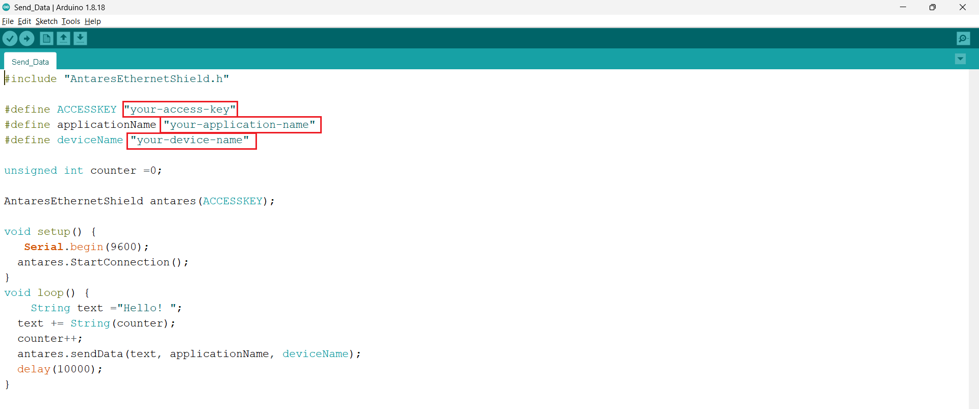 2. In the example source code send data library Arduino Uno Ethernet Shield, change the accesskey, application name and device name with your own.
