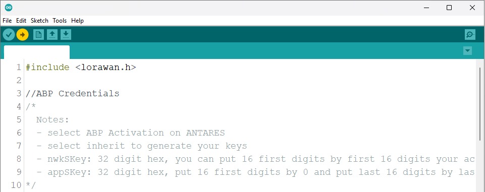 Change the LoRaWAN ABP parameters in the following variables  **`*devAddr`** , **`*nwkSkey`** and **`*appSKey.`** Adjust to the parameters in the Antares console.