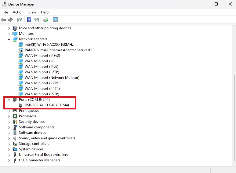 On Windows operating systems the check can be done via **Device Manager**. If your **Lynx-32 Development Board** is read, the **USB-Serial CH340** will appear with the port adjusting the port availability (in this case it reads **COM4**).