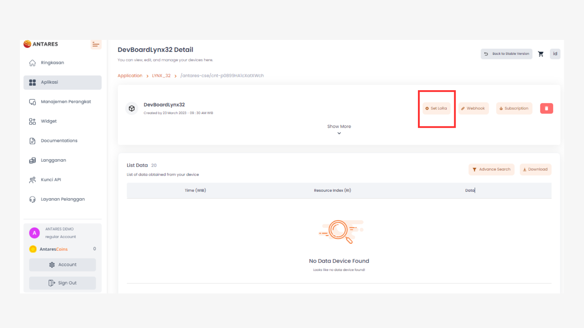 On the Antares Device console page, set the LoRa by pressing the **Set LoRa** button as shown below.
