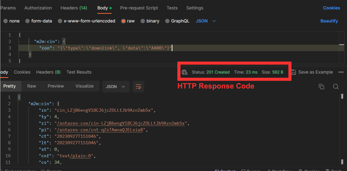 After the step of sending the downlink message in the POSTMAN software is successful, then open the Antares device page and see if the downlink command has entered Antares.