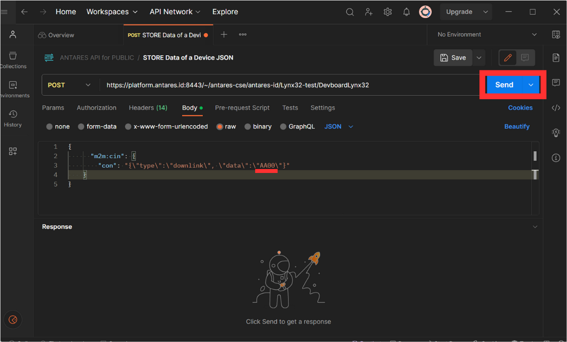 <table data-header-hidden><thead><tr><th width="119"></th><th></th></tr></thead><tbody><tr><td><strong>Methode</strong></td><td>POST</td></tr><tr><td><strong>URL</strong></td><td>https://platform.antares.id:8443/~/antares-cse/antares-id/<mark style="color:red;">your-application-name/your-device-name</mark></td></tr></tbody></table>