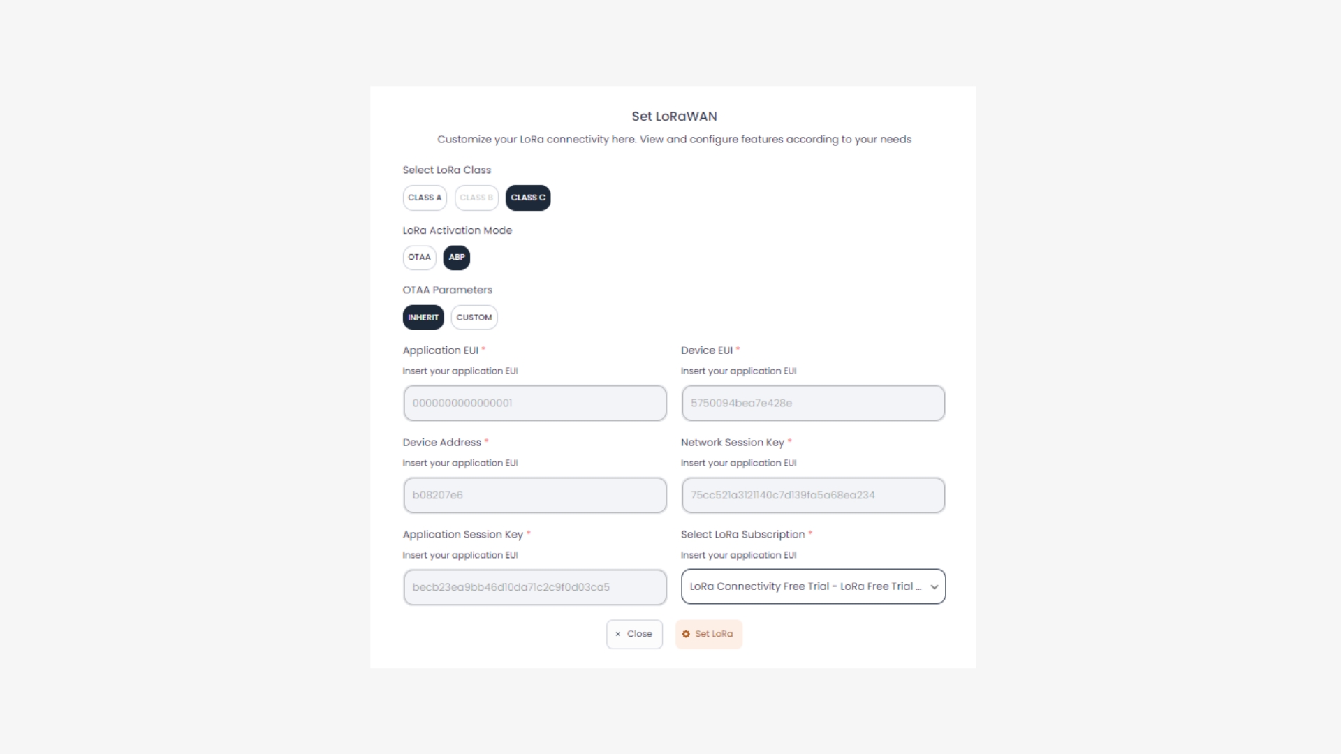 Don't forget to save (copy) the Network Session Key and Application Session Key parameters before clicking Set LoRa to facilitate the next process.