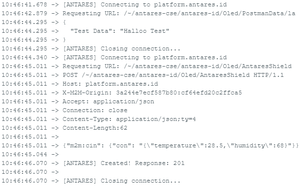 <figure><img src="https://3873791589-files.gitbook.io/~/files/v0/b/gitbook-x-prod.appspot.com/o/spaces%2F7cujmJ5QHdJaAjH815aZ%2Fuploads%2F1HZhj0aTrASuRviufhVt%2Fimage.png?alt=media&#x26;token=0796cbc9-d1ec-4e1f-ab8b-c70d75f623ff" alt=""><figcaption><p>Image of the Antares Console Page When Data is Successfully Received from the DHT11 Sensor.</p></figcaption></figure>