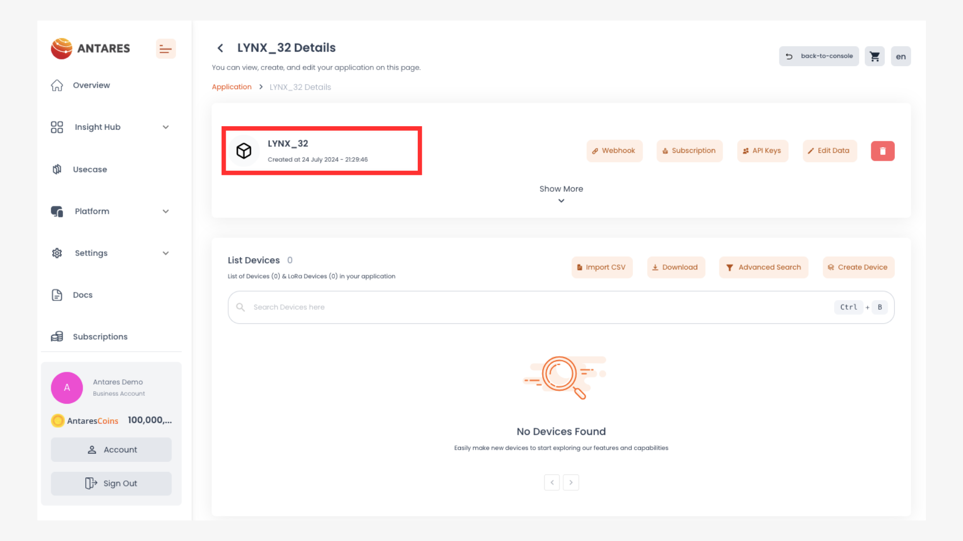 The parameters **\*projectName** and **\*deviceName** are obtained from the **Application Name** and **Device Name** that have been created in the Antares account.