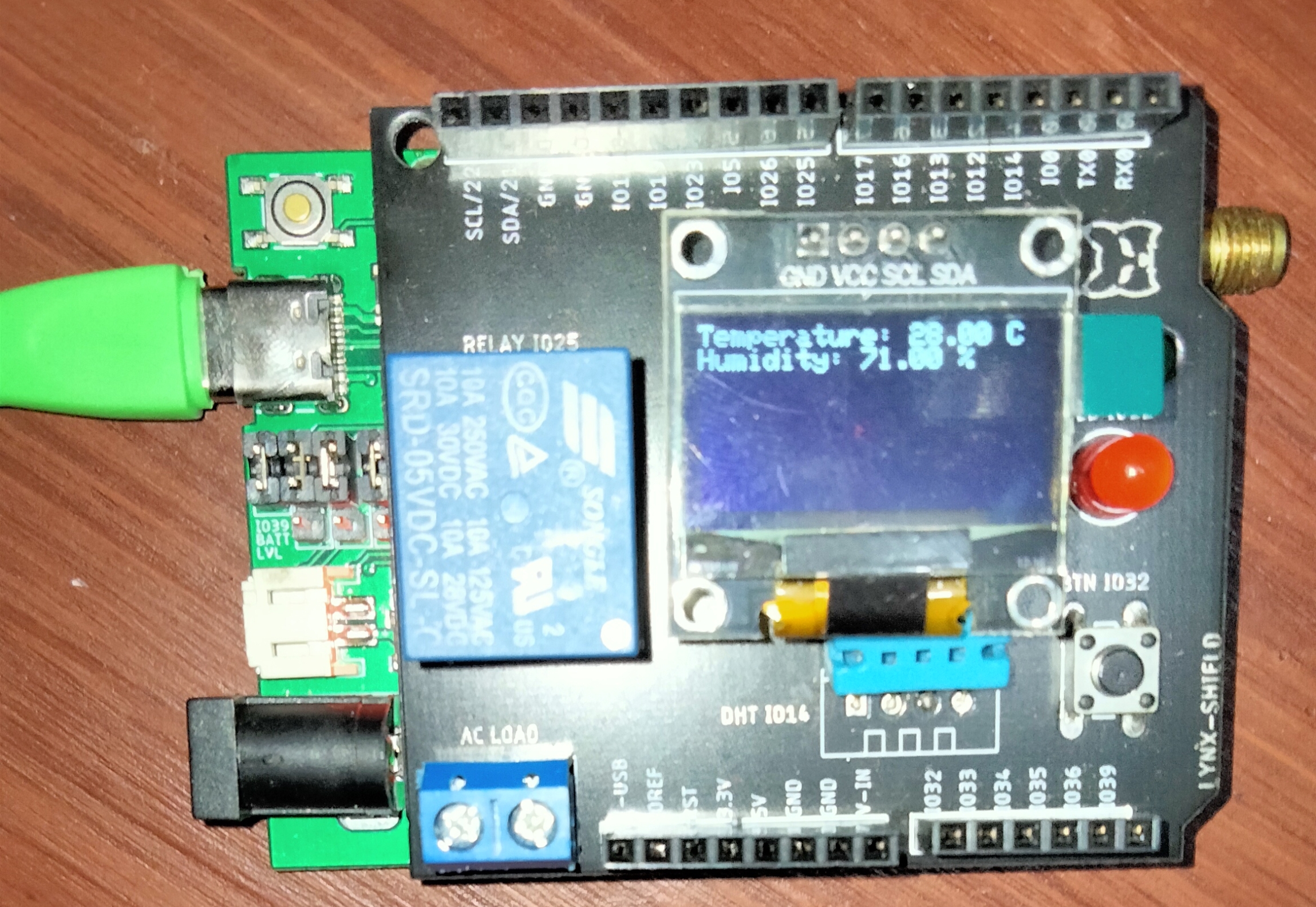 In this project, you will use the **Antares Workshop Shield** on the Lynx-32 **Development Board** module. In this **Antares Shield Workshop**, there are temperature, humidity (DHT11), relay, LED and push button sensors. You will monitor the temperature and humidity according to the specified interval period. The results of the data sent by the sensors can be monitored through the Antares console and displayed on the OLED.
