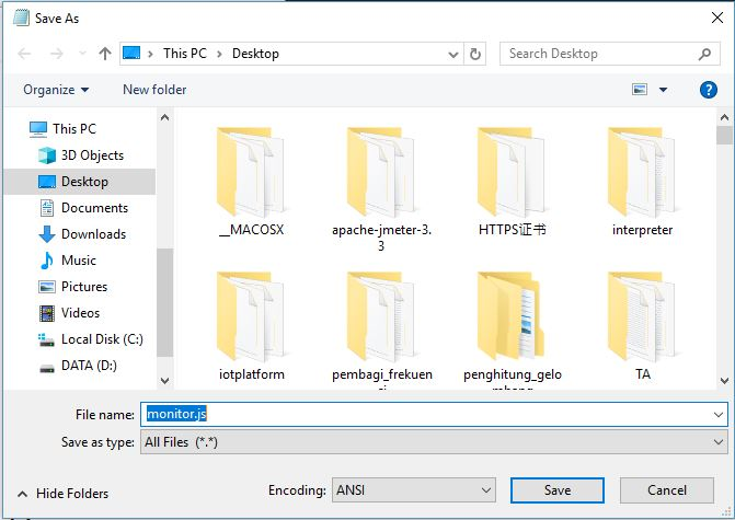 1. Start by writing the programme code to get data from ANTARES. You can use the following programme code: Copy the program code to your computer's local storage then save it in **.js extension** format. In this tutorial, we save it with monitor.js