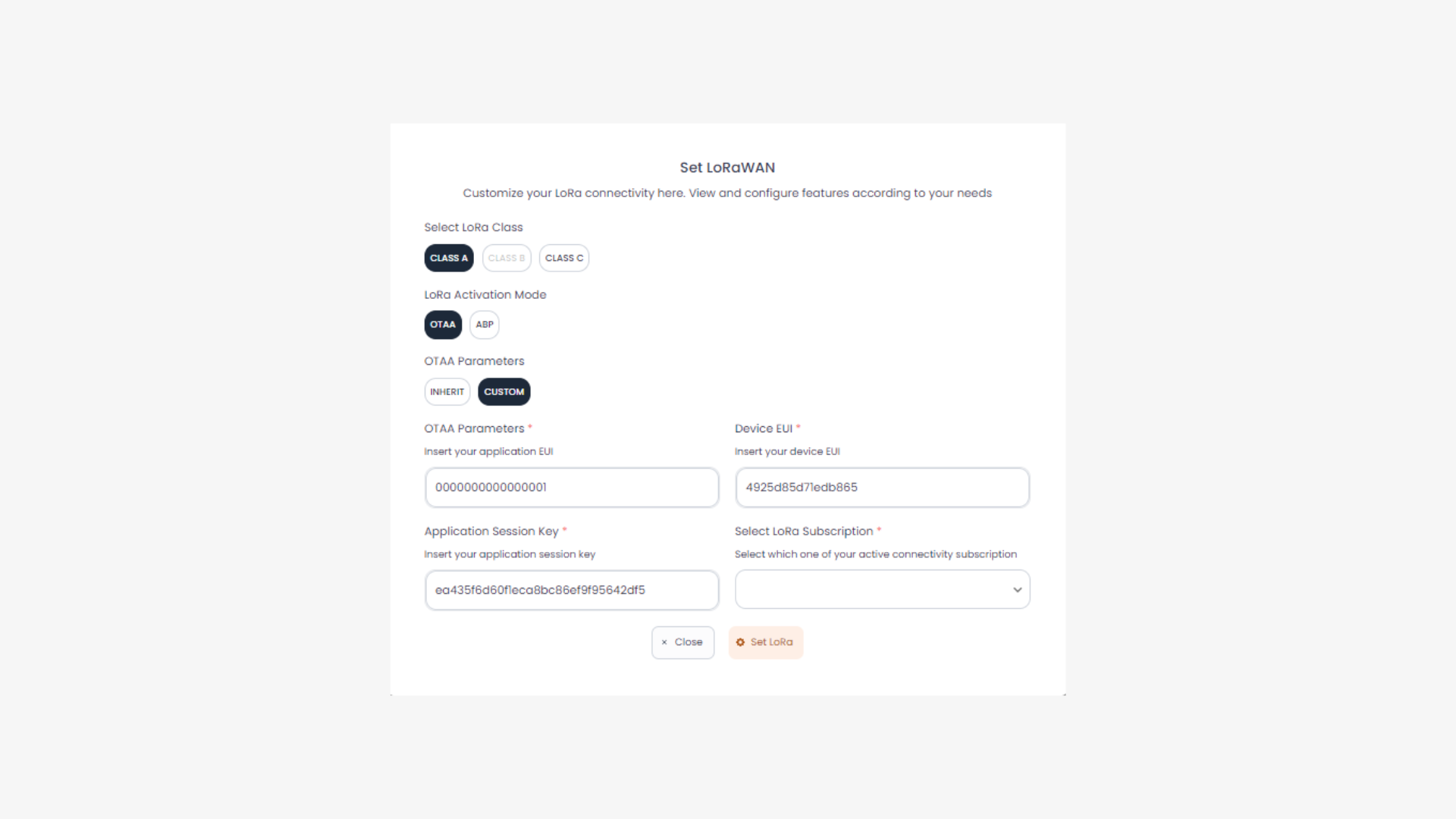 In the OTAA activation process there are 3 keys that need to be inputted, namely Device EUI (DevEUI), Application EUI (AppEUI) and Application Key (AppKey). For these keys, you can use the keys provided by ANTARES by using the Inherit option. As for devices whose keys are already embedded in the device, they can be inputted by selecting custom.