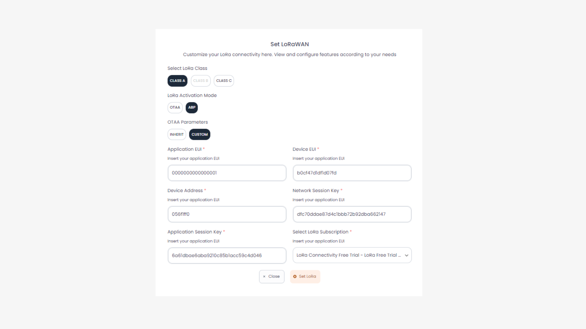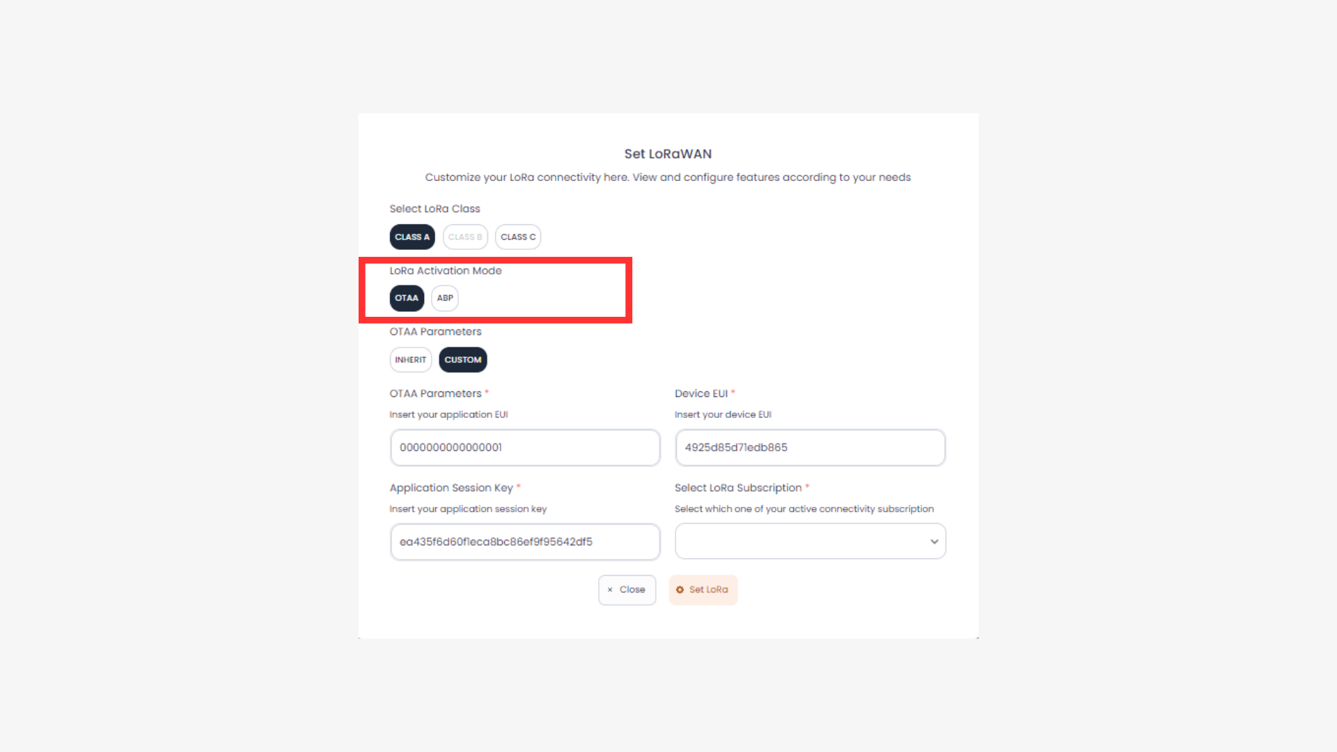 The activation selection must match the configuration on the device. There are 2 activation options which are ABP and OTAA.