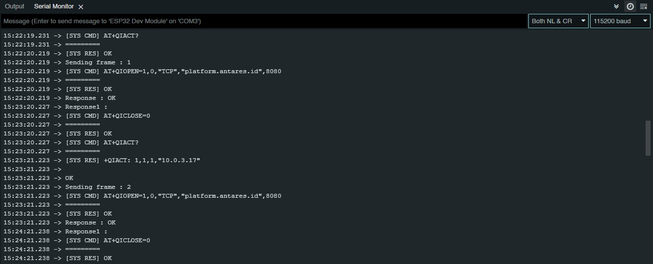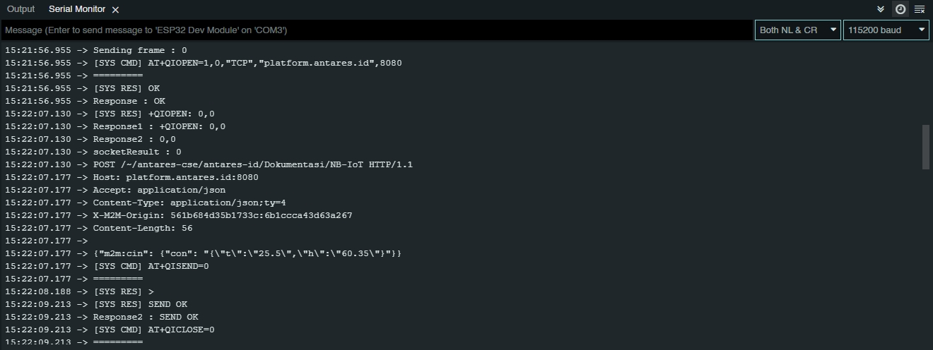 After the IP is successfully obtained, the NB-LYNX-95 module is ready to send data to the Antares IoT Platform. The process of sending data is marked with the words "Sending frame" which starts from frame 0. Then the module will access the Antares server with a TCP connection to send data. The following is the display on the serial monitor.