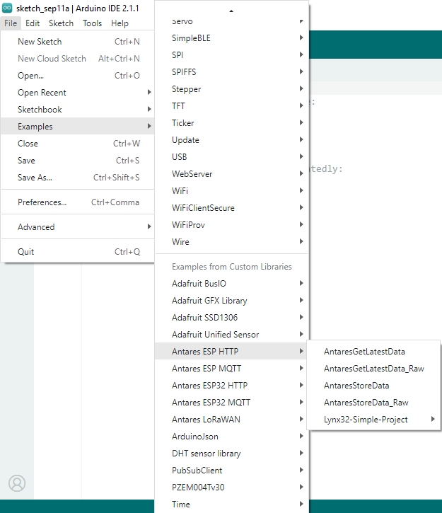 If the library installation is successful, you can see the example programme in the File > Examples > Antares ESP HTTP menu. The result looks like the following image.
